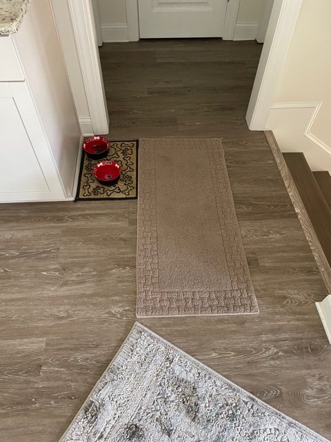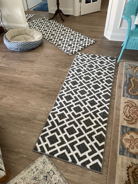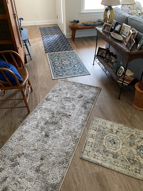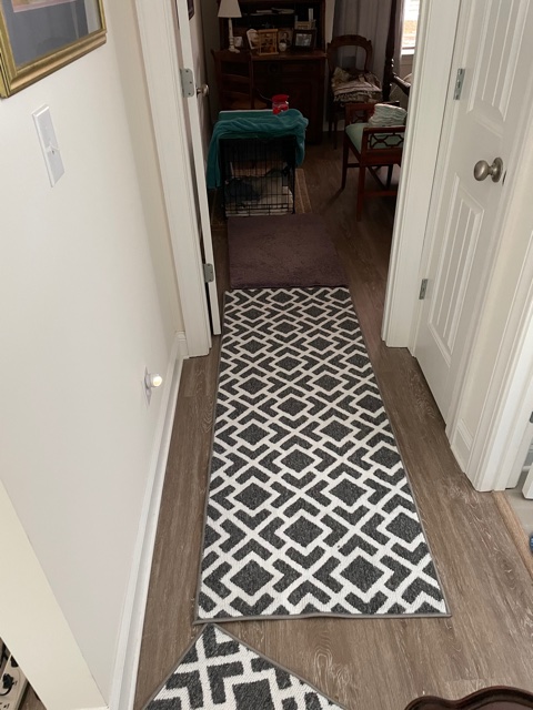 This will not make HGTV or any decorating magazines, but we went to a two local stores looking for throw rugs. Only three of them match, and we like some better than others. We spread them out end-to-end and created paths for Heinz to walk on the carpets and not lose his footing. Mission accomplished.